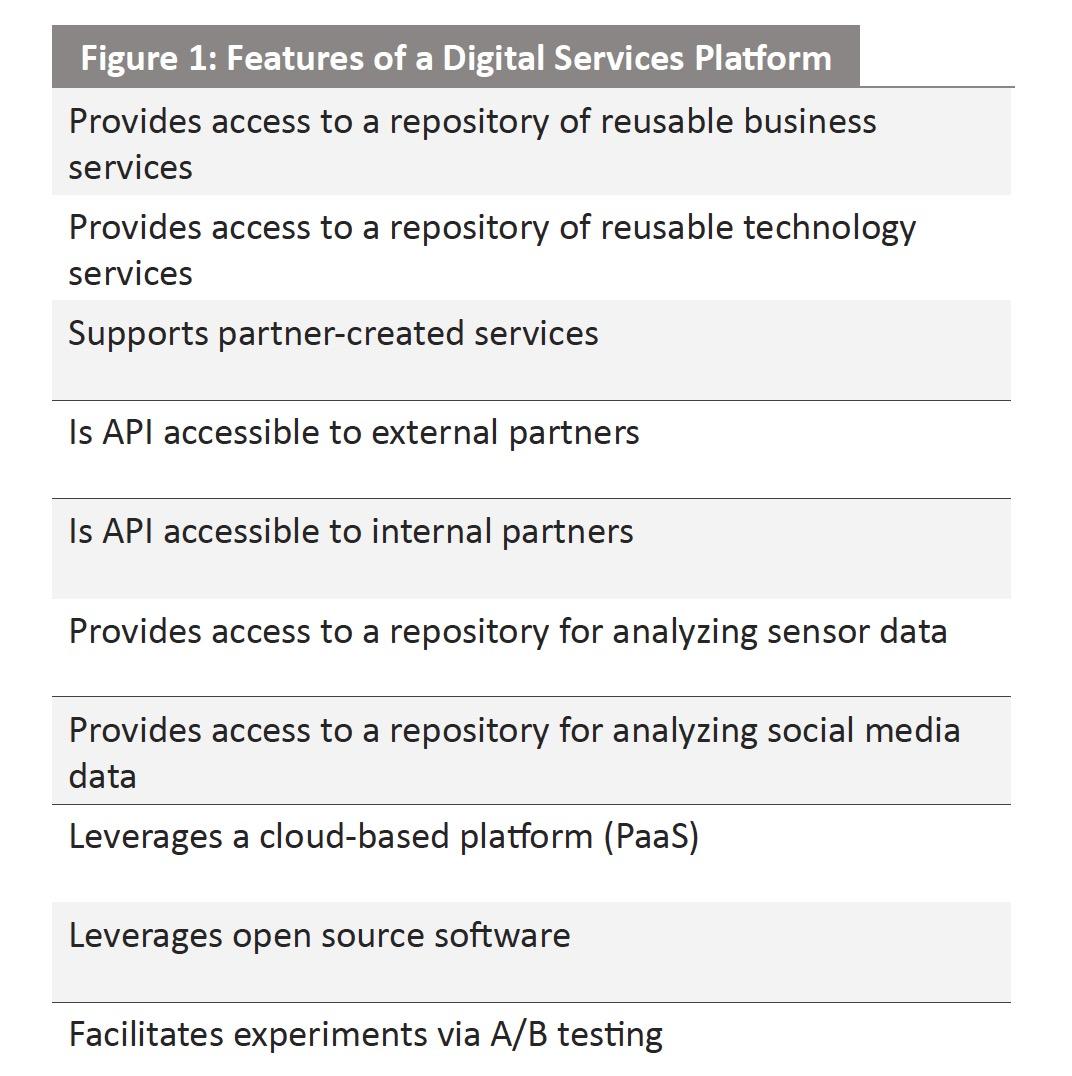 MIT CISR research has identified a set of ten key features common to a digital services platform (see figure 1). Together these features help companies capture the benefits of new technologies and new sources of data. In a recent survey of 171 senior executives, we learned that companies with a digital services platform were 3 times more innovative and 2.4 times more agile than companies without such a platform.[foot]The Designing Digital Organizations 2016 Survey, N=171, was conducted jointly by the MIT Sloan Center for Information Systems Research (CISR) and The Boston Consulting Group (BCG). More details will be available in J.W. Ross, I.M. Sebastian, C.M. Beath, Lipsa Jha, and the Technology Advantage Practice of The Boston Consulting Group, “Designing Digital Organizations—Summary of Survey Findings,” MIT Sloan CISR Working Paper No. 415, forthcoming.[/foot]