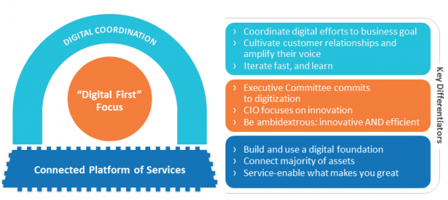 3. Digital coordination: Digital leaders coordinate all their digital efforts to meet a larger business goal—such as providing a multiproduct integrated customer experience—then iterate and learn from these efforts. In contrast, digital laggards—slow to invest or with a “let a thousand flowers bloom” mindset—struggle to monetize and coordinate their efforts.