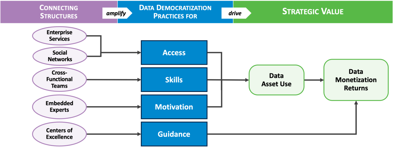 Most seasoned leaders know that the availability of data assets does not automatically lead to their use; achieving a data democracy requires intentional design. In this briefing, we outline a framework for driving data asset use based on democratization practices regarding access, skills, motivation, and guidance, and the connecting structures that amplify them.[foot]Connecting structures are organizational arrangements that facilitate knowledge exchange between data experts and domain experts. For an overview of the five connecting structures, see I. A. Someh and B. H. Wixom, “Data-Driven Transformation at Microsoft,” MIT CISR Research Briefing, Vol. XVII, No. 8, August 2022, https://cisr.mit.edu/publication/2017_0801_DataDrivenTransformation_SomehWixom.[/foot] By systematically investing in these practices and structures, organizations can increase the use of their available data assets and thereby maximize the value they realize from their data investments.