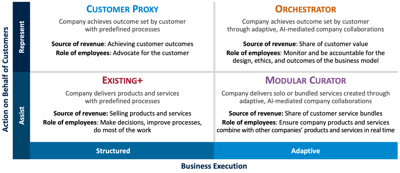 Given the speed with which AI is developing and the opportunities it offers to reinvent companies, we are sharing our predictions of how business models—how companies make money—will evolve over the next five-plus years. We started this work by analyzing MIT CISR studies from 2013 to 2025 (with data from 2,378 companies) on how business models have evolved.[foot]MIT CISR collected business model data from companies in 2013 (101 companies in one survey, 93 in another), 2019 (1,311 companies), 2022 (721 companies), and 2025 (152 companies), each time using the same questions and placing companies on MIT CISR’s Digital Business Models framework, described in Peter Weill and Stephanie L. Woerner, What’s Your Digital Business Model?: Six Questions To Help You Build the Next-Generation Enterprise (Harvard Business Review Press, 2018). The methodology places each company into one business model, but companies can operate in multiple business models, as our case vignettes and interviews show. In 2025, to contemplate business models five years out and beyond, we convened a group of four researchers (including a former CIO) to imagine how the key dimensions differentiating business models will evolve with the rise of advanced AI (e.g., generative AI, agentic AI, robotic systems) and formulate a new framework. We then tested the framework by presenting and discussing it in a series of senior executive meetings.[/foot] For example, the percentage of companies in our research that lead or participate in a digital ecosystem has increased from 30 percent in 2013 to 81 percent in 2025, with commensurate increases in revenue growth and net profit. This dramatic shift illustrates how in just twelve years digital technologies have revamped business models. We expect the next decade will see an even more dramatic change as companies develop AI-driven, real-time business models.
